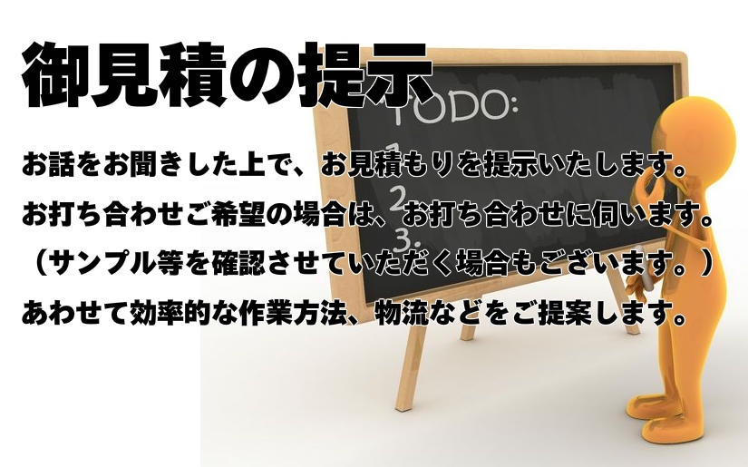 プライスカード ・ スタンド ・ パネル ・ 値札吊り ・ 天吊り・ のぼり などを作製する内職です。組立やシール貼りなど様々な工程を細分化して工場内作業び内職作業にてPOPを完成させていきます。